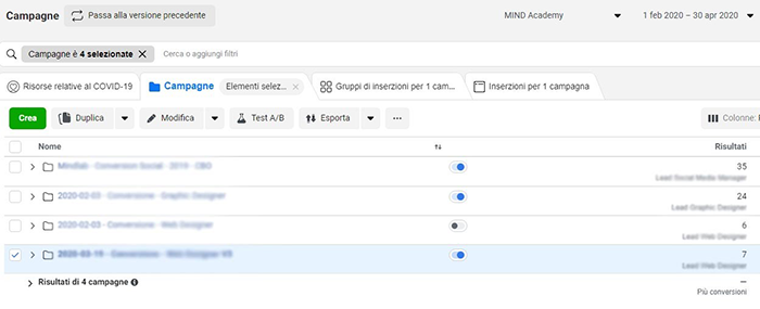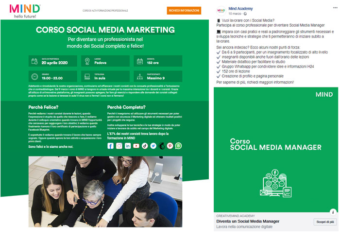 Dopo un primo studio del target, sulla base delle indicazioni del cliente e dell’audience presente sui social network, si è passati alla creazione delle inserzioni vere e proprie, rendendole quanto più possibile coerenti con le landing page specifiche per ogni corso, ed evidenziando nel testo i punti di forza di MIND.
