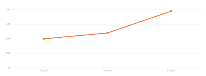 Le campagne Google Ads hanno registrato un aumento delle conversioni di trimestre in trimestre. Di seguito il grafico con l’andamento delle conversioni da aprile 2019 a dicembre 2019, suddiviso per trimestre: