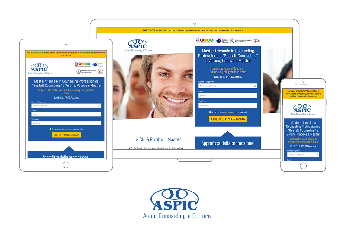 Aspic è un’associazione con sede centrale a Roma, con più di 40 sedi in tutta Italia. È considerata la Scuola di Counseling più grande in Italia. Vera Cabras, responsabile della sede ASPIC di Verona e di Padova, inizialmente ci ha scelto per la promozione della sede di Verona. Visti gli ottimi risultati, in seguito c’è stata affidata anche la promozione per le sedi di Padova, Mestre.