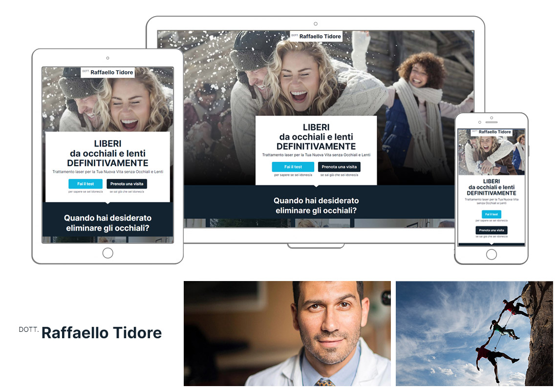 La landing aveva un duplice scopo: da una parte informare le persone, sulla chirurgia refrattiva e sulla specializzazione del Dott. Raffaello Tidore, per renderle consapevoli della scelta e dall’altra filtrare solo i contatti idonei all’operazione. Abbiamo quindi realizzato una landing che informasse le persone sul trattamento laser, con una marcata impronta emozionale puntando su scenari di vita quotidiana, ed integrando un test realizzato tramite la piattaforma Typeform.